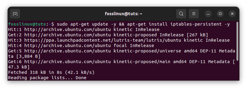 sudo apt-get update -y && apt-get install iptables-persistent -y