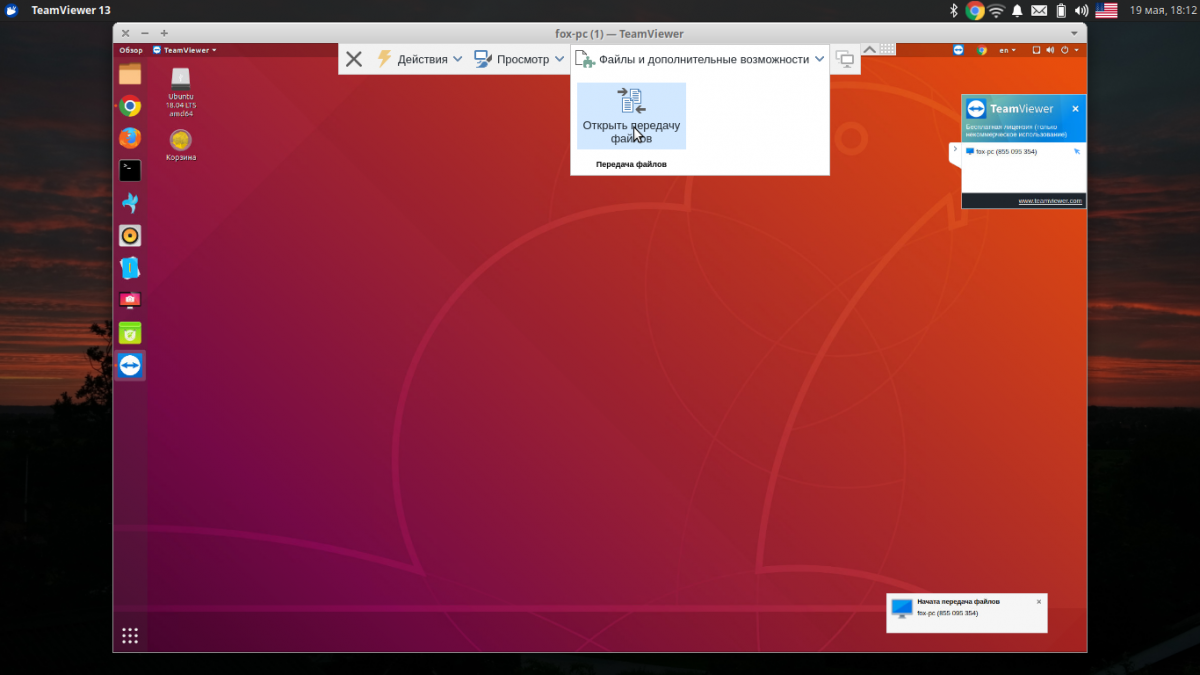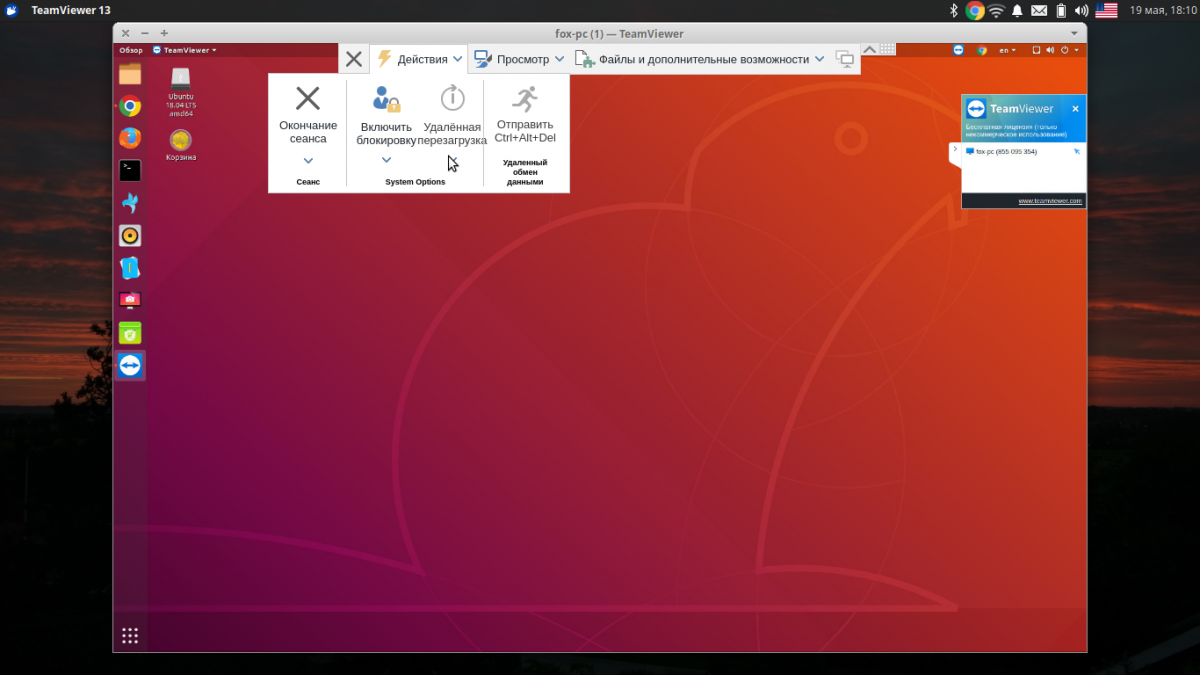 Верхняя панель предоставляет различные опции для TeamViewer. На вкладке «Действия» вы можете найти варианты завершения сеанса, или же перезагрузки устройства.