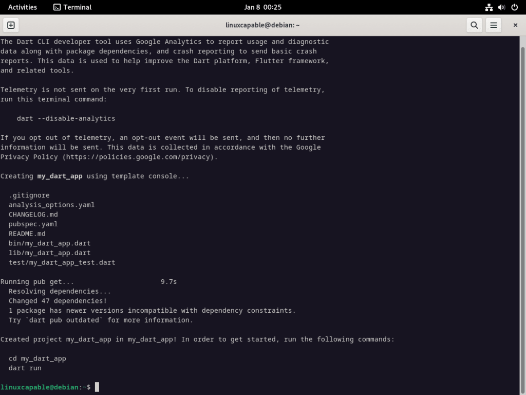 Примечание: dart create внутренне выполняет dart pub get для анализа сгенерированного файла pubspec и загрузки необходимых зависимостей. Если вы добавите дополнительные зависимости позже, запустите dart pub get снова, чтобы получить их.