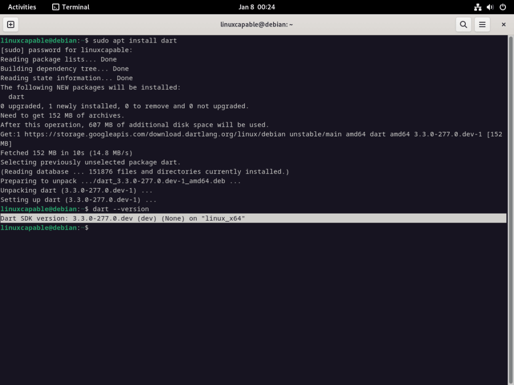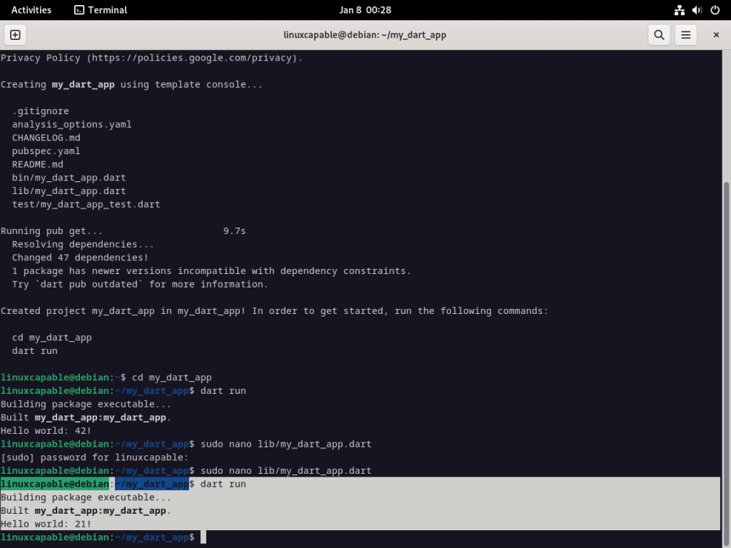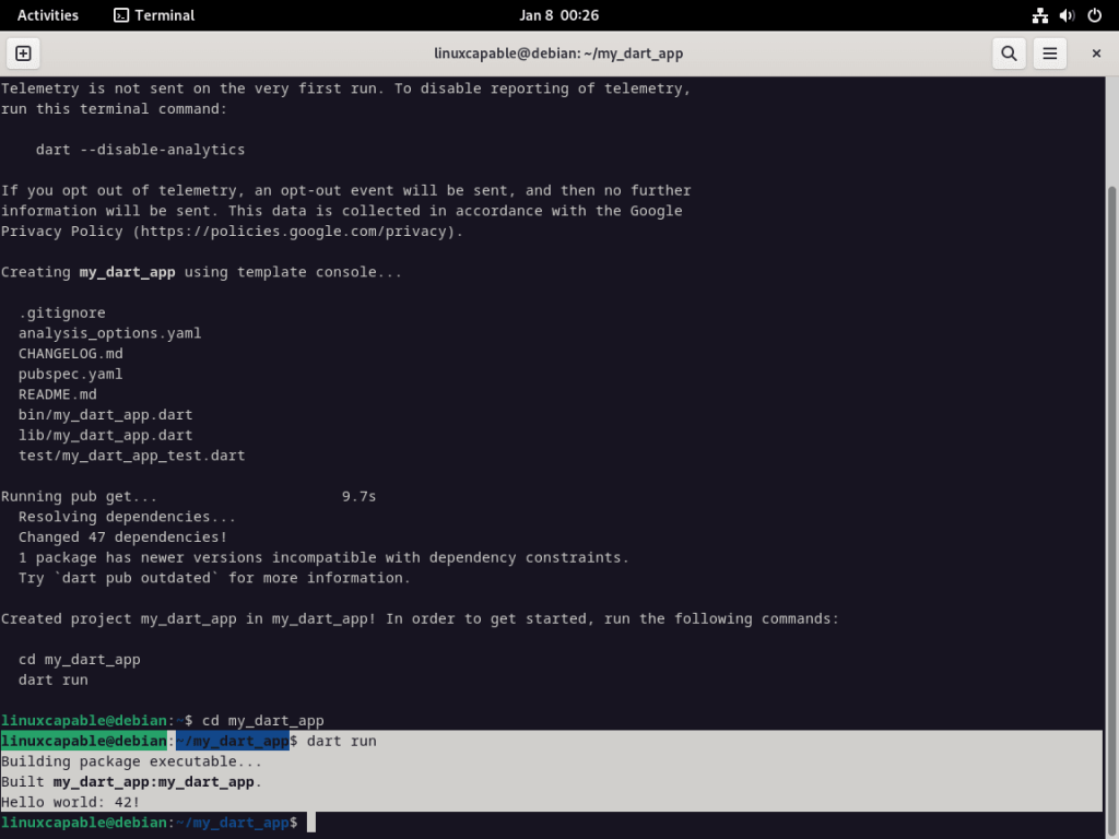 В этом руководстве мы рассмотрели шаги по установке Dart на вашу систему Debian, от обновления индекса пакетов и установки Dart до создания и настройки базового приложения командной строки. Мы также рассмотрели компиляцию приложения для использования в производстве, чтобы вы были готовы к созданию более сложных проектов с уверенностью. Помните, что ключ к освоению Dart лежит в экспериментах и последовательной практике. Так что погружайтесь в работу, изучайте новые возможности и начинайте создавать свое следующее замечательное приложение.