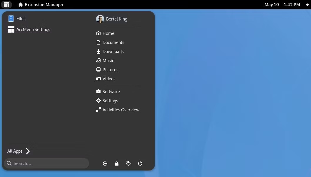 Ви також маєте швидкий доступ до домашніх папок, а також до магазину програм GNOME Software та системних налаштувань. ArcMenu також за замовчуванням відкривається, натиснувши клавішу Super, замінюючи Огляд дій.