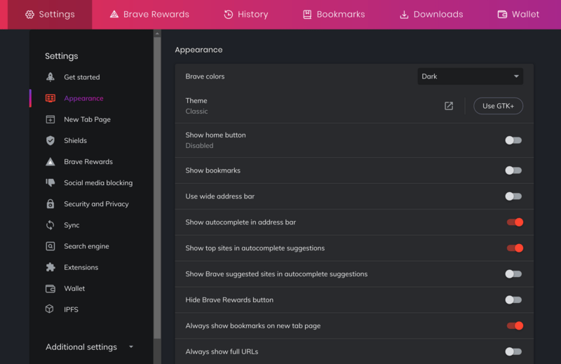 Навіть у цьому випадку Brave надає широкі можливості для налаштування існуючого інтерфейсу. Наприклад, можливість використовувати широкий адресний рядок, показувати повні URL-адреси, показувати кнопку пошуку на вкладці, показувати/приховувати кнопку «Додому» та багато іншого.