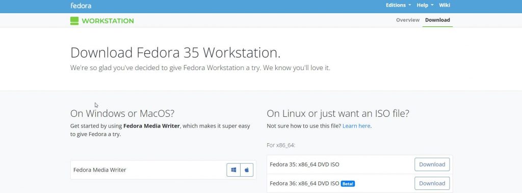 Fedora надає користувачам Windows та Mac інструмент під назвою Fedora Media Writer для створення завантажувального носія на USB-накопичувачі, але користувачі також можуть самі завантажити образ ISO та створити власний носій. Образи Fedora 36 для x86 та ARM мають чітку позначку “Beta!”.