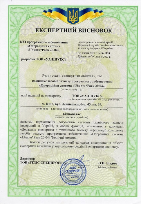 Отримання експертного висновку ДССЗЗІ України №1133 на “Захищену операційну систему Ubuntu * Pack” необхідно для використання системи в органах державної влади, силових відомствах, муніципального самоврядування, освітніх і медичних установах, виробничих, фінансових та інших організаціях, де циркулює інформація з персональним даними будь-якого типу, із службовою та конфіденційною інформацією і з державною таємницею.