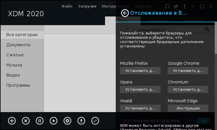 При першому запуску у нас відкривається головне вікно програми відразу з пропозицією встановити додаткові плагіни для інтеграції XDM з браузерами.