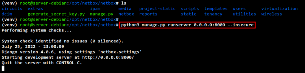Нарешті, виконайте наступну команду, щоб протестувати та перевірити інсталяцію NetBox. Якщо ваша установка виконана правильно, ви побачите, що netBox працює на порту «8000».