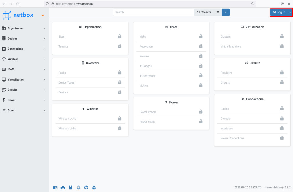 Щоб перевірити інсталяцію, відкрийте веб-браузер та перейдіть на доменне ім’я установки NetBox. І ви повинні отримати панель адміністрування для NetBox із заблокованим статусом.