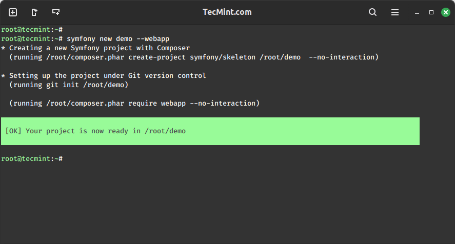 Теперь выполним следующую команду, чтобы создать новый проект веб-приложения Symfony.