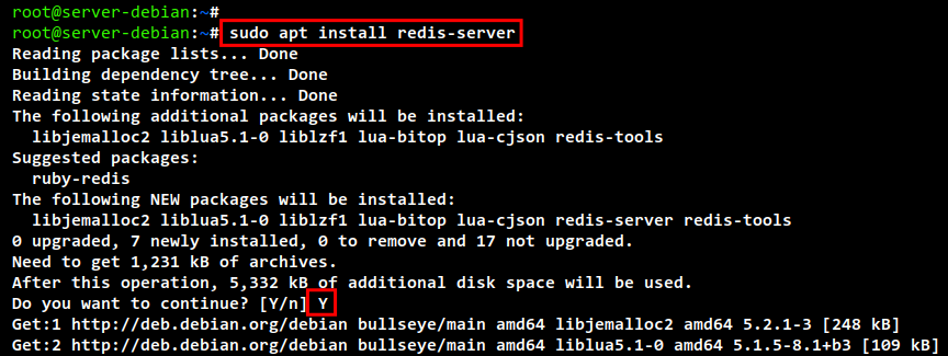 Чтобы начать установку Redis, выполните приведенную ниже команду apt. Введите Y, чтобы подтвердить установку, и нажмите ENTER, после чего начнется установка Redis.